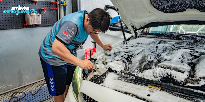 Quy trình rửa xe Detailing sử dụng dung dịch chuyên dụng và thiết bị hiện đại để làm sạch sâu từng chi tiết trên xe, từ bề mặt sơn, kính, lazang đến khoang máy và hốc bánh. Quá trình này giúp loại bỏ bụi bẩn, dầu mỡ và các vết bẩn cứng đầu, bảo vệ bề mặt sơn và giữ cho xe luôn sạch sẽ, bóng bẩy.