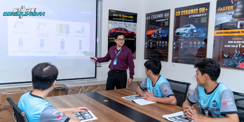 Tại khóa học, kỹ năng hiệu chỉnh bề mặt sơn được truyền đạt một cách chi tiết nhằm khắc phục trầy xước, quầng xoáy và tình trạng oxy hóa. Tiếp đó là phần thực hành phủ ceramic, giúp tạo lớp bảo vệ bền chắc, giữ màu sơn bóng đẹp lâu dài. Nhờ liên tục thao tác trên nhiều dòng xe, mỗi học viên dễ dàng nâng cao tay nghề và tự tin áp dụng vào thực tế.