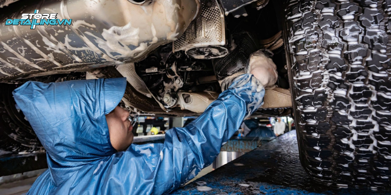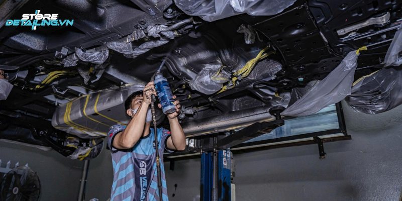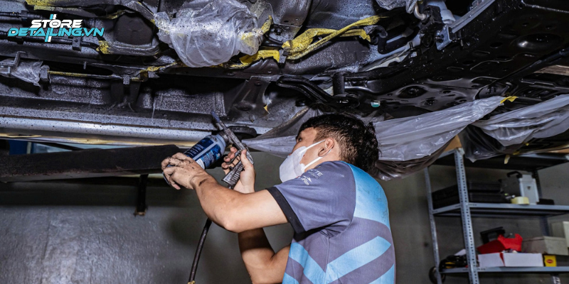 Trong hạng mục này, học viên được đào tạo quy trình vệ sinh và xử lý bề mặt khung gầm xe trước khi phủ lớp bảo vệ. Giảng viên hướng dẫn cách sử dụng dung dịch, súng phun và thao tác che chắn để đảm bảo lớp phủ đều, bám chắc và không ảnh hưởng đến các bộ phận khác tại khu vực gầm xe.