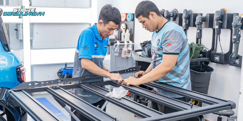 Điều đặc biệt trong khóa đào tạo là toàn bộ các buổi học đều diễn ra tại hệ thống garage của STORE DETAILING. Học viên được trực tiếp quan sát, thực hành trên xe tại xưởng và làm quen với những tình huống thường gặp trong quá trình thi công. Giảng viên luôn theo sát, hướng dẫn chi tiết và chia sẻ kinh nghiệm thực tế.