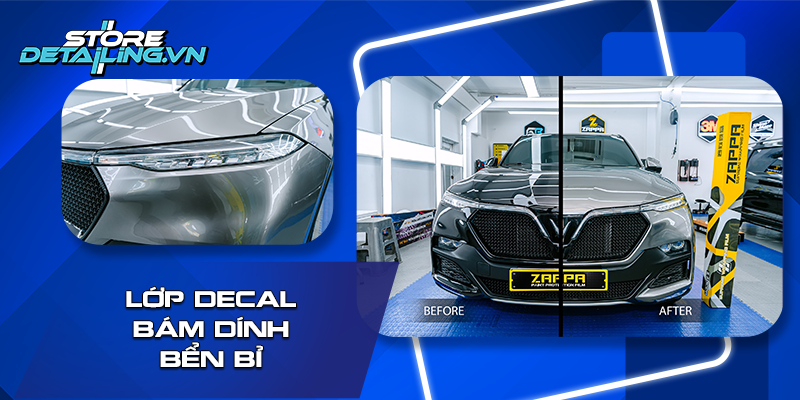 Dòng decal Zappa cao cấp sở hữu độ bền màu và khả năng bám dính ấn tượng, trung bình từ 3 đến 5 năm tùy vào điều kiện sử dụng và cách chăm sóc xe. Nhờ chất lượng vượt trội, lớp decal bám cực chắc vào bề mặt sơn của chiếc Lux SA, triệt tiêu rủi ro bong tróc ngay cả khi xe di chuyển thường xuyên dưới thời tiết khắc nghiệt. Tại STORE DETAILING, chúng tôi còn áp dụng kỹ thuật cuộn mí sâu vào các khe kỹ thuật, giúp tăng cường tối đa độ bền và tính thẩm mỹ cho toàn bộ bề mặt dán.