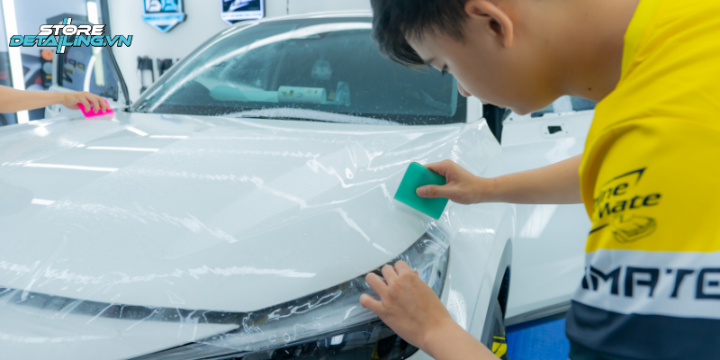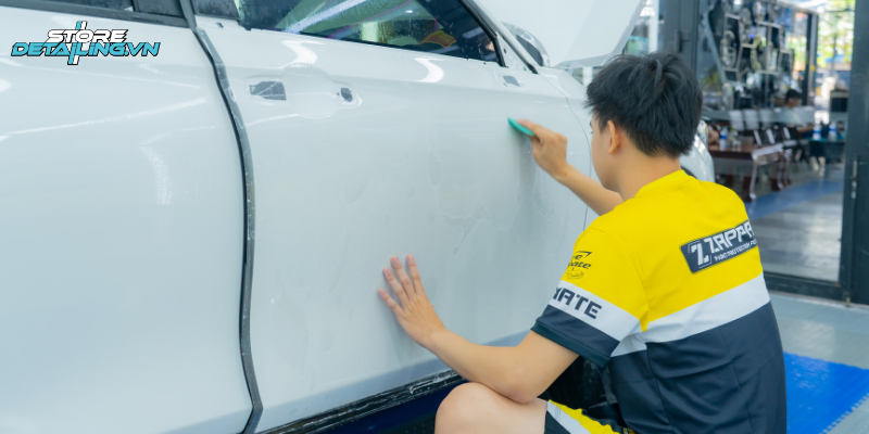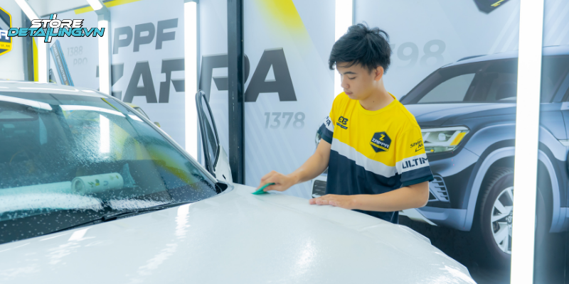 Quy trình dán PPF tại STORE DETAILING được thực hiện trong phòng kín đạt tiêu chuẩn. Đội ngũ kỹ thuật viên thao tác chính xác từng chi tiết, đảm bảo lớp màng PPF ôm sát bề mặt sơn, không bong tróc hoặc nổi bọt khí.