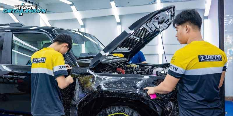 Quy trình dán PPF Zappa 1398 tại STOREDETAILING được thực hiện một cách chuyên nghiệp và tỉ mỉ. Đầu tiên, xe được vệ sinh sạch sẽ toàn bộ bề mặt cần dán để loại bỏ bụi bẩn, dầu mỡ và các tạp chất, đảm bảo bề mặt sơn hoàn toàn sạch và khô ráo.