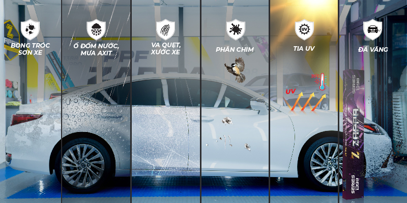 Phim được tích hợp công nghệ chống tia UV và oxy hóa, bảo vệ lớp sơn xe khỏi tác động tiêu cực của ánh nắng mặt trời và các yếu tố môi trường khác. Nhờ đó, phim giúp giữ màu sơn bền đẹp lâu dài, tránh hiện tượng sơn bị ngả màu, bạc màu theo thời gian.