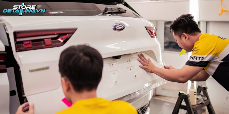 Tại STORE DETAILING, quy trình thi công PPF Zappa 1388 cho dòng xe Ford Territory được thực hiện theo các bước bài bản, khép kín và đảm bảo tiêu chuẩn kỹ thuật cao nhất. Trước khi dán, xe được làm sạch toàn bộ bề mặt sơn bằng các sản phẩm chuyên dụng, loại bỏ hoàn toàn bụi bẩn, tạp chất và các vết dầu để đảm bảo độ bám dính tối ưu cho màng phim.
