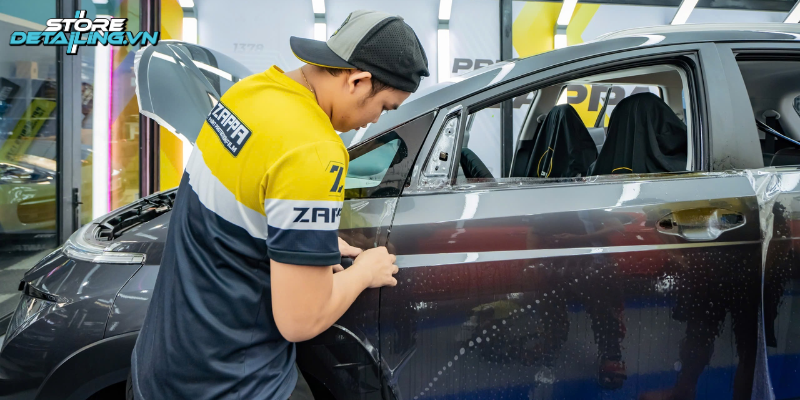 Quy trình dán PPF tại STOREDETAILING được thực hiện bài bản và chuyên nghiệp, bắt đầu từ việc rửa sạch và làm sạch kỹ lưỡng bề mặt xe để loại bỏ bụi bẩn, sáp và các tạp chất. Tiếp theo, kỹ thuật viên sẽ kiểm tra sơn để phát hiện và xử lý các vết trầy xước nhỏ nếu có.