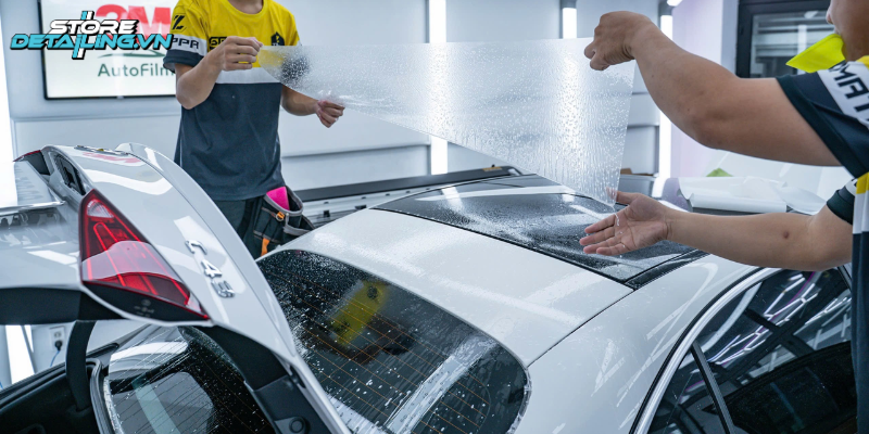 Sau đó, bề mặt sơn được xử lý kỹ bằng clay bar và kiểm tra chi tiết bằng đèn chuyên dụng để phát hiện lỗi nhỏ. Kỹ thuật viên sẽ cắt phim theo từng khuôn xe và tiến hành dán với sự hỗ trợ của dung dịch kích hoạt, đảm bảo không có bọt khí và nếp nhăn. Sau khi hoàn tất, toàn bộ xe sẽ được kiểm tra lại lần cuối và bàn giao cùng sổ bảo hành chính hãng.