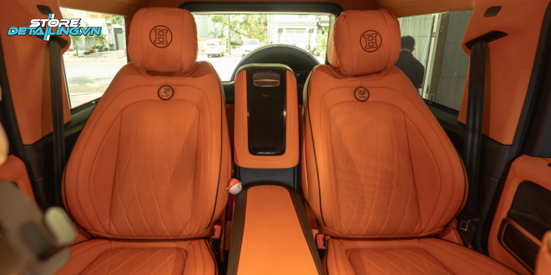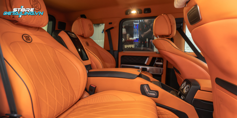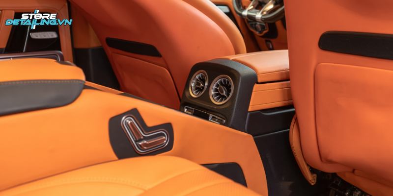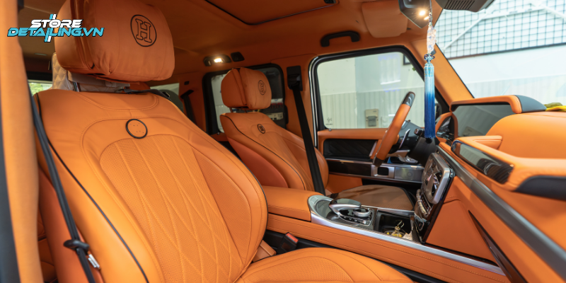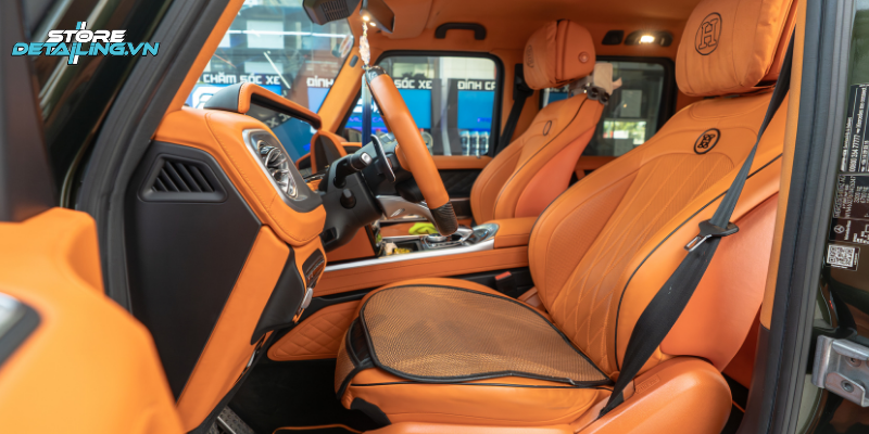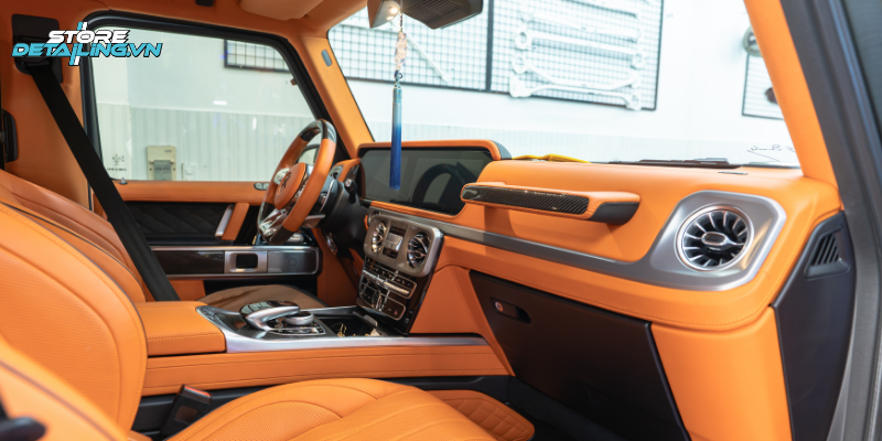 Mercedes G63 vốn mang thiết kế mạnh mẽ và nam tính, nhưng việc đổi màu nội thất sang tone cam giúp chiếc xe trở nên nổi bật và mang dấu ấn cá nhân rõ ràng hơn. Tại STORE DETAILING, khách hàng được tư vấn phối màu nội thất cam phù hợp với tổng thể xe, đảm bảo sự hài hòa, sang trọng nhưng vẫn giữ được tính thực dụng.