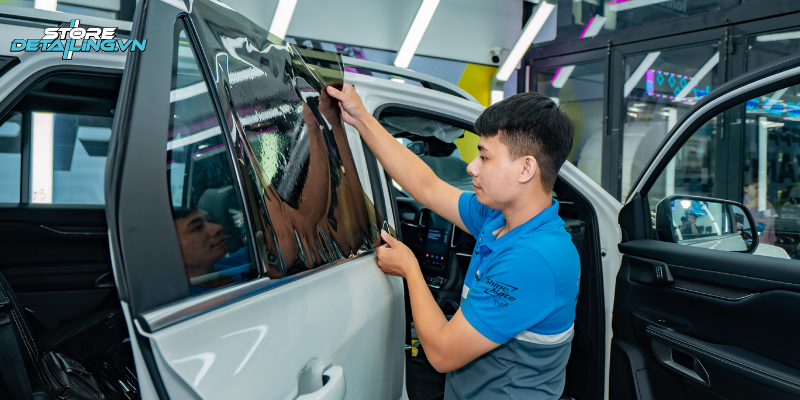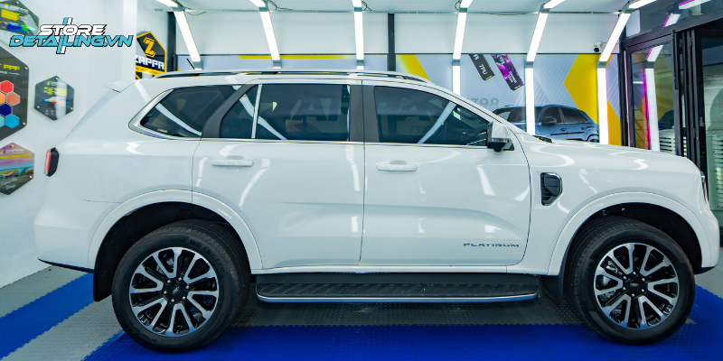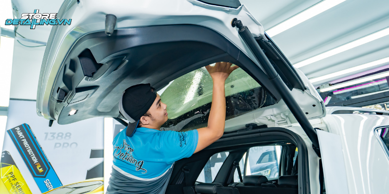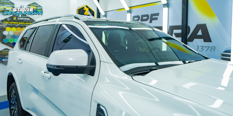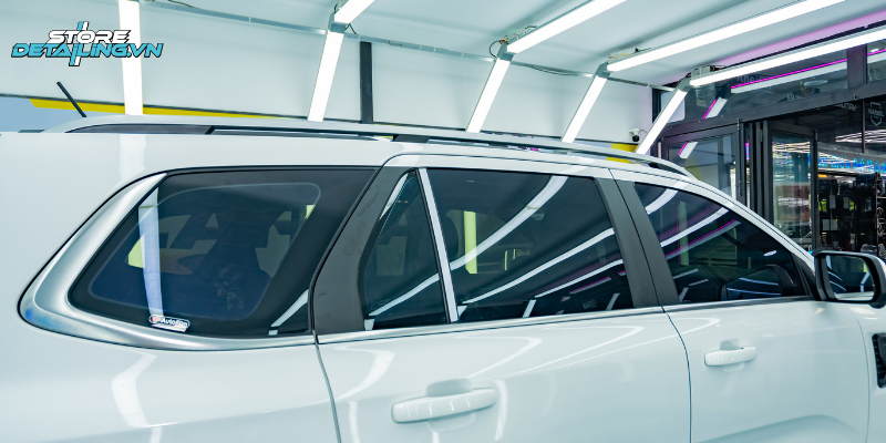 Tại STORE DETAILING, quá trình dán phim cho chiếc Everest được thực hiện trong phòng kín với quy trình chặt chẽ. Mỗi mặt kính đều được làm sạch, cắt phim chính xác và ép chặt theo từng đường kính đặc trưng của. Nhờ thao tác đúng chuẩn và kỹ thuật thi công khéo léo, lớp phim luôn bám khít, không bọt khí và giữ thẩm mỹ bền vững theo thời gian.