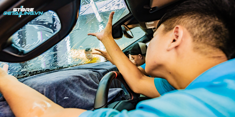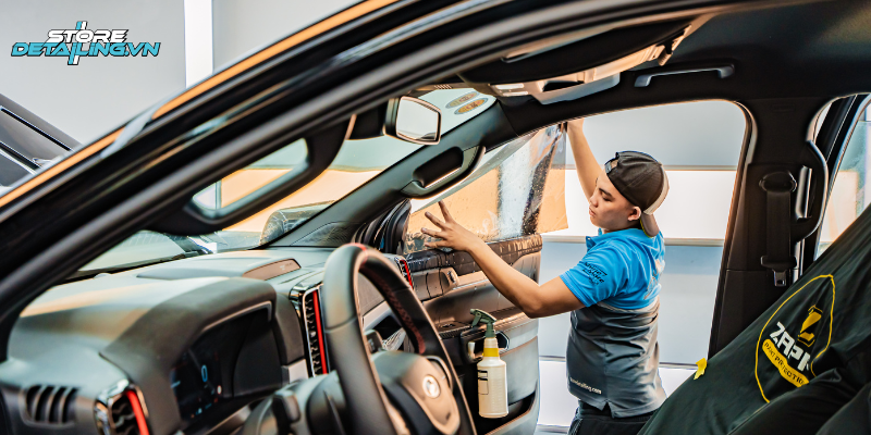 Dán phim cách nhiệt cho Ford Ranger Raptor đòi hỏi thao tác chuẩn xác, môi trường sạch bụi và kỹ thuật phù hợp với kính lớn đặc trưng của xe bán tải. Tại STORE DETAILING, quy trình được chuẩn hóa và thực hiện tỉ mỉ qua các bước sau:
