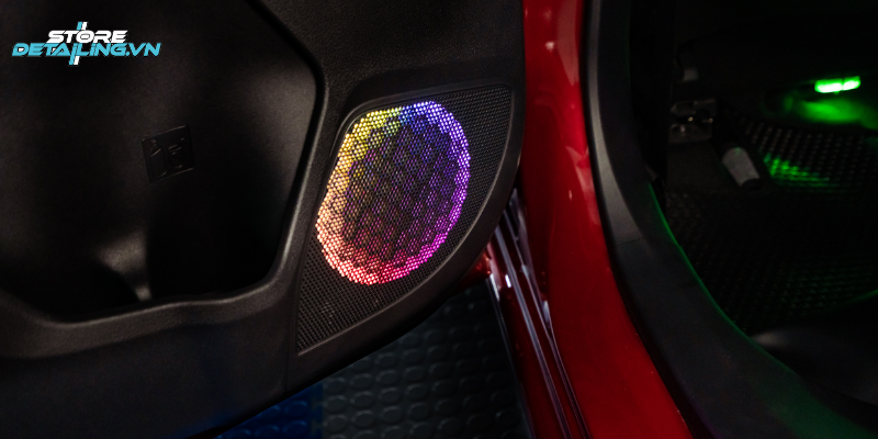 LED được lắp ngay sau lớp lưới loa, tạo hiệu ứng phát sáng dạng vòng tròn với nhiều màu sắc khác nhau. Khi kích hoạt, ánh sáng xuyên qua bề mặt lưới tạo hiệu ứng chuyển màu nổi bật, giúp phần cửa trở thành điểm nhấn độc đáo. Không quá rực rỡ, ánh sáng vừa đủ để gây ấn tượng mà vẫn giữ sự tinh tế cho nội thất Wigo.