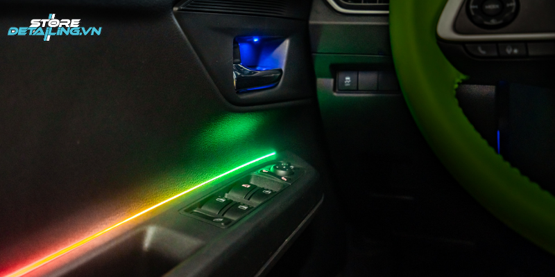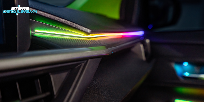 Dải LED được thi công âm sát theo mép tappi cửa, tạo hiệu ứng ánh sáng mềm mại. Khi mở cửa hoặc khi lái xe buổi tối, ánh sáng lan nhẹ theo đường viền cánh cửa giúp không gian thêm sinh động và tăng tính thẩm mỹ. Cách bố trí này không phá vỡ thiết kế nguyên bản mà còn làm nổi bật hình khối của phần cửa, mang lại cảm giác rộng và thoáng hơn khi bước vào cabin.