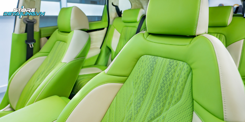 Tone màu xanh lá – kem được chủ xe lựa chọn nhằm tạo sự khác biệt, vừa trẻ trung vừa sang trọng. STORE DETAILING đã phối hợp các mảng màu một cách hài hòa, kết hợp đường chỉ may nổi bật và những chi tiết sơn đổi màu tinh tế, giúp tổng thể nội thất đồng bộ và mang đậm dấu ấn cá nhân.