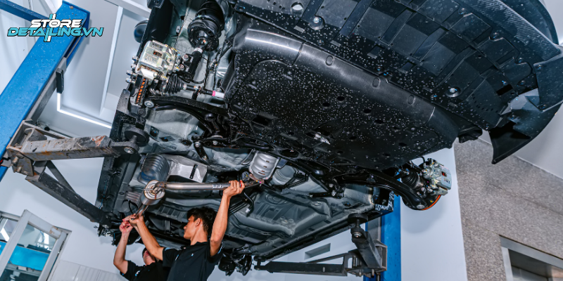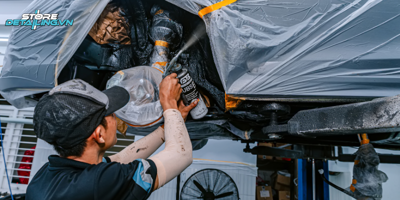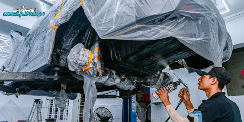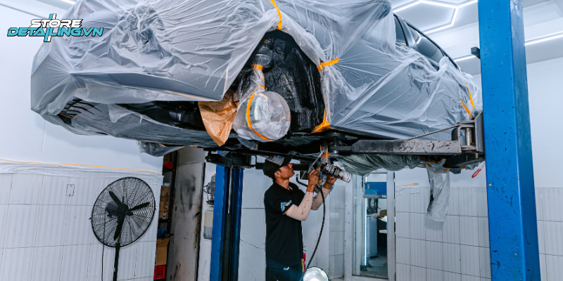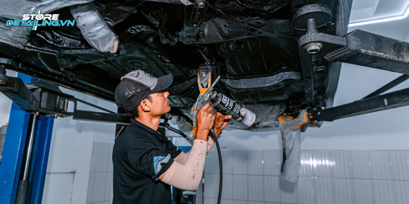 Tại STORE DETAILING, các bước thi công phủ gầm được thực hiện theo quy trình chuyên nghiệp như sau: