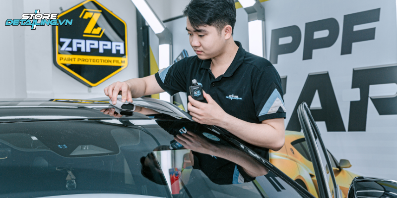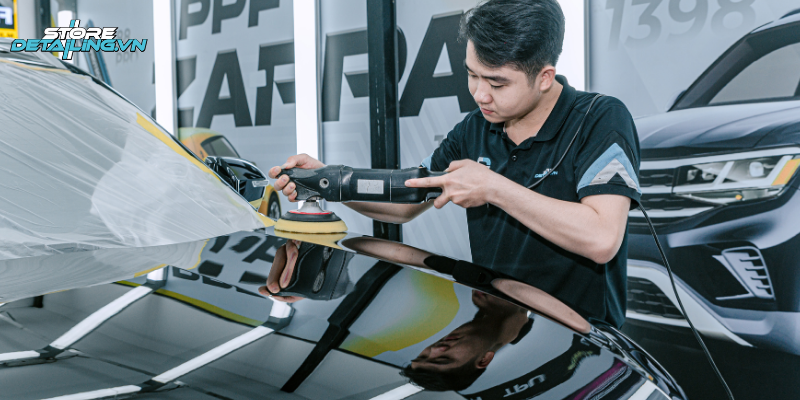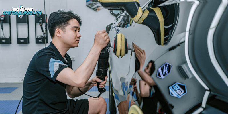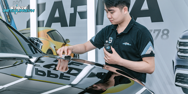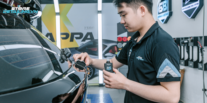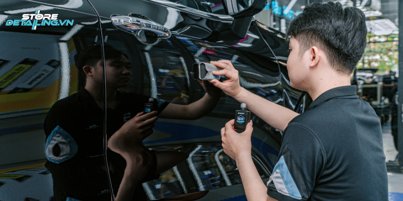 Để lớp phủ Ceramic 9H+ phát huy tối đa hiệu quả bảo vệ và duy trì độ bóng bền đẹp, quy trình thi công tại STORE DETAILING luôn được chuẩn hóa, thực hiện tỉ mỉ trong môi trường chuyên biệt. Các bước cơ bản bao gồm: