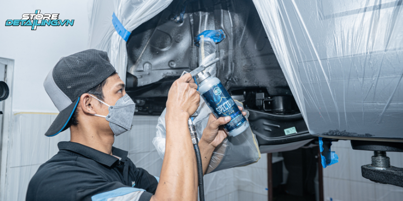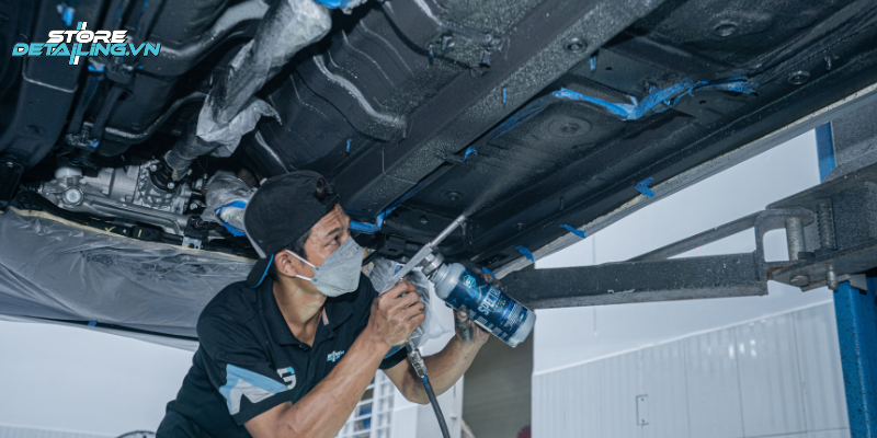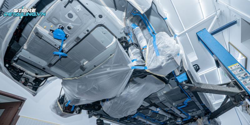 Dịch vụ phủ gầm quang phổ tại STORE DETAILING được thực hiện theo quy trình 6 bước chuẩn kỹ thuật, đảm bảo lớp phủ bám chắc, dày đều và phát huy tối đa hiệu quả chống gỉ, cách âm và thẩm mỹ.