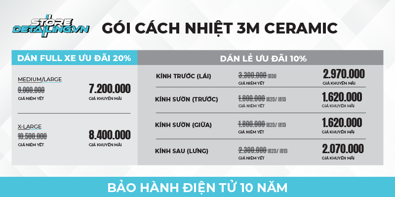 Phim cách nhiệt 3M Ceramic hiện đang được áp dụng ưu đãi giảm 20% cho gói dán full xe, với mức giá chỉ từ 7.200.000 VNĐ - 8.400.000 VNĐ tùy kích cỡ xe. Khi dán lẻ từng vị trí, khách hàng cũng được giảm 10% so với giá niêm yết. Đặc biệt, khi dán full xe, bạn sẽ được tặng phủ Ceramic toàn bộ kính trị giá 2.500.000 VNĐ.