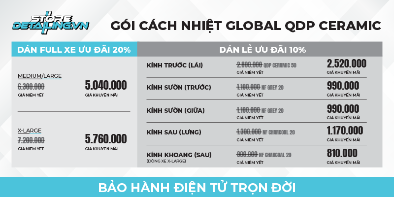 Phim cách nhiệt Global QDP Ceramic là lựa chọn hiệu quả và tiết kiệm, được giảm 20% cho gói full xe, giá chỉ từ 5.040.000 VNĐ - 5.760.000 VNĐ tùy kích cỡ xe, hoặc giảm 10% khi khách hàng lựa chọn dán lẻ từng vị trí.