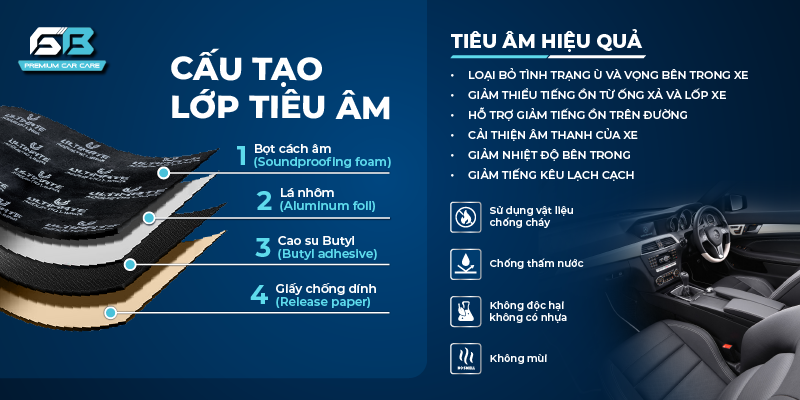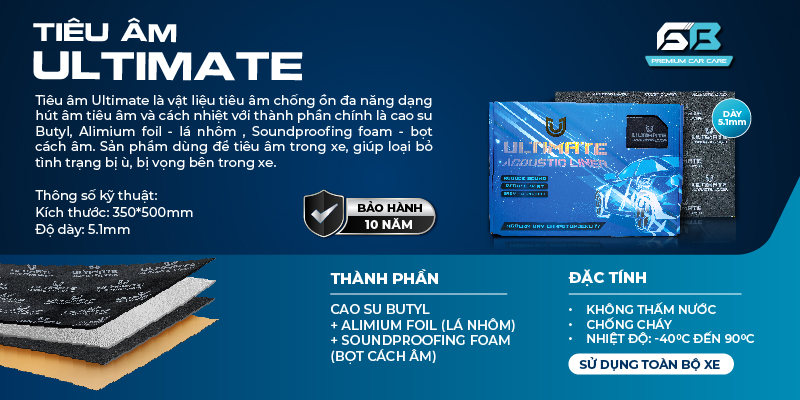 Đồng thời, tiêu âm Ultimate còn cải thiện âm thanh trong xe, giữ nhiệt độ ổn định, tạo không gian thoải mái và sang trọng. Với các đặc tính nổi bật như không thấm nước, chống cháy, không mùi và hoạt động tốt trong dải nhiệt độ từ -40°C đến 90°C, sản phẩm đảm bảo an toàn và không gây hại cho sức khỏe.